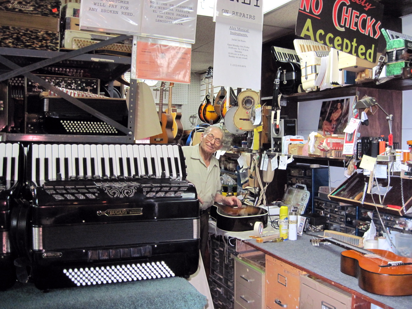 When he let me out, I learned that Alex was born in Italy and grew up in Argentina, where he mastered the accordion trade. “I came here with four hundred dollars in my pocket when I get off the plane,” he told me. “No English — just Italian and Spanish.”
